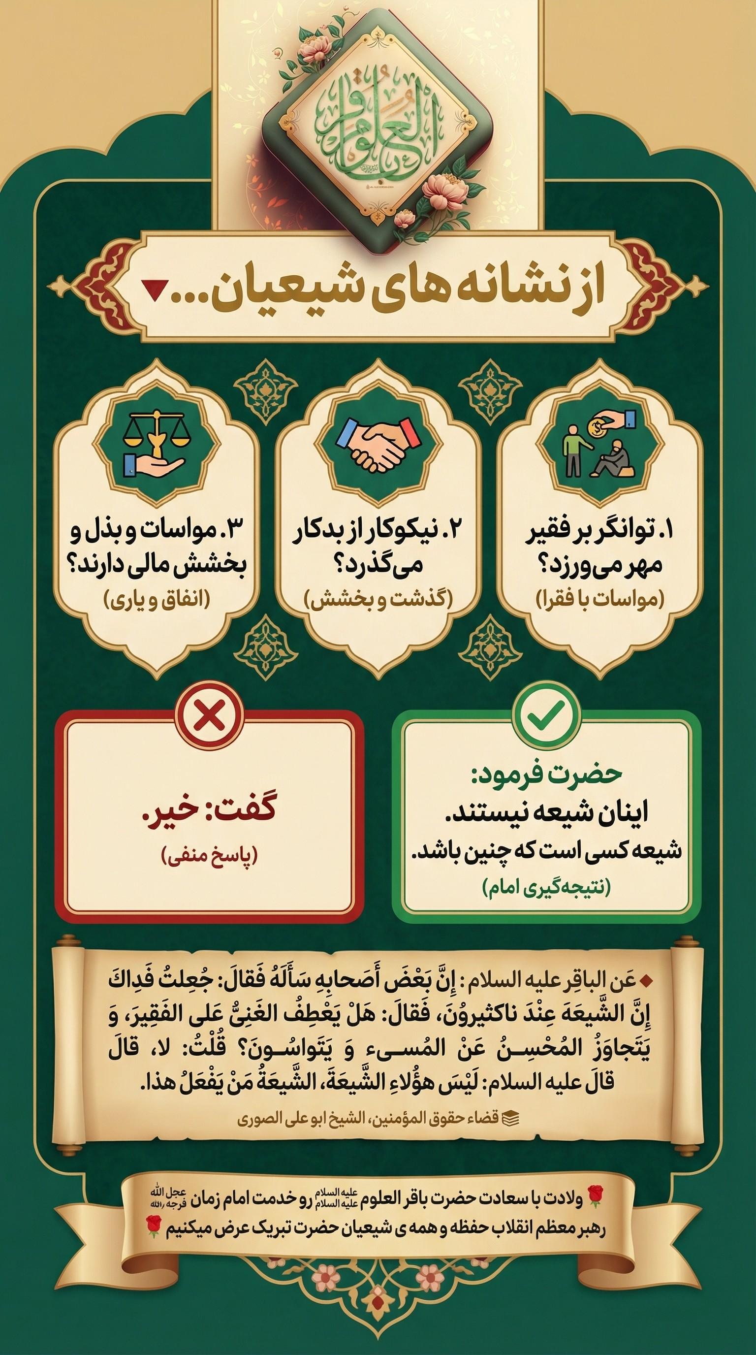 عَن الباقِر عليه السلام : اِنَّ بَعْضَ اَصَحْابِهِ سَأَلَهُ فَقالَ: جُعِلتُ فَدِاكَ اِنَّ الشّيعَهَ عِنْدَ ناكثيروُنَ، فَقالَ: هَلْ يَعْطِفُ الغَنِىُّ عَلى الفَقيرَ، وَ يَتَجاوَزُ المُحْسِنُ عَنْ المُسى ء وَ يَتَواسُونَ؟ قُلْتُ: لا، قالَ عليه السلام : لَيْسَ هؤُلاءِ الشّيعَةَ، الشَّيعَةُ مَنْ يَفْعَلُ هذا.